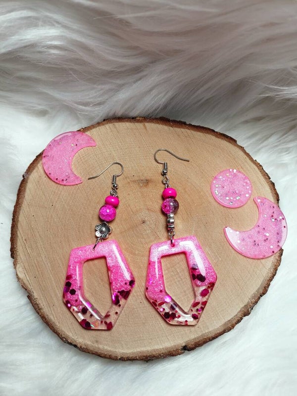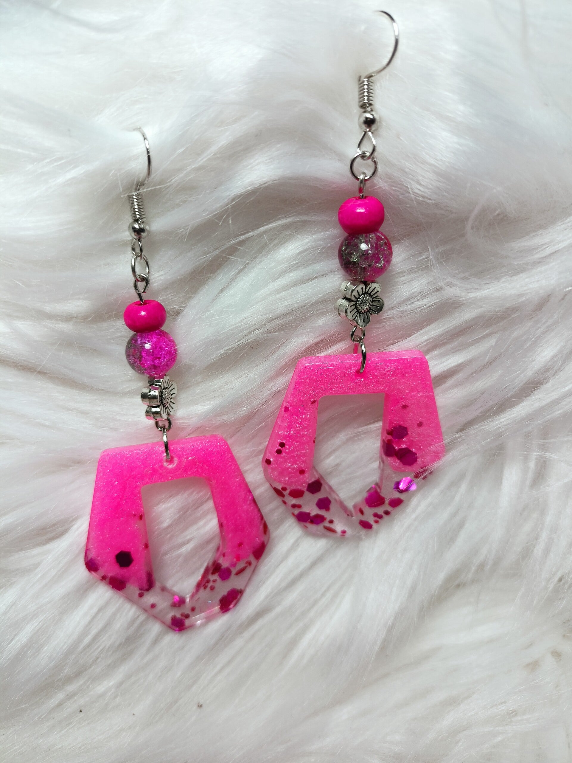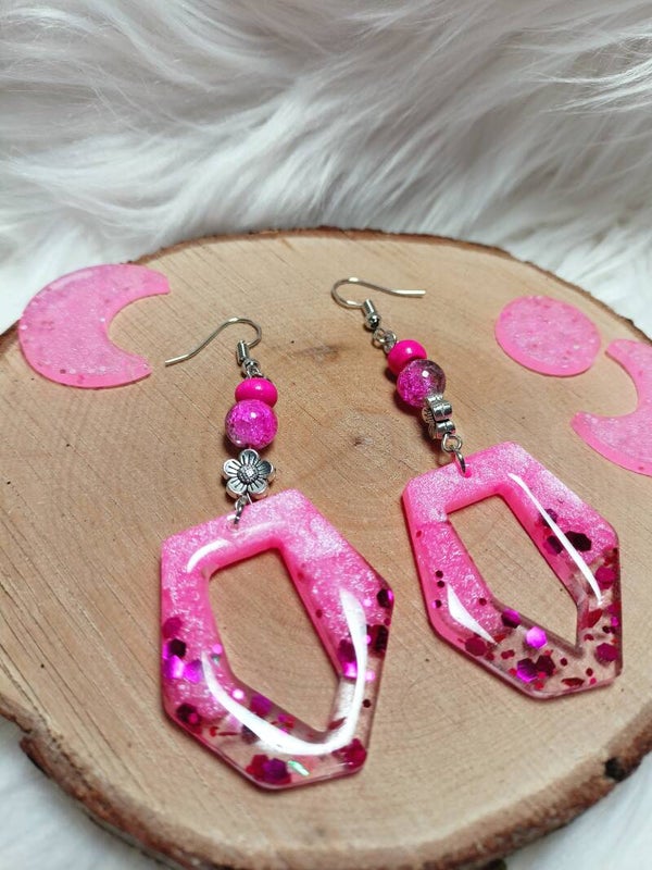 Orecchini pendenti rosa e trasparenti con glitter e perline.